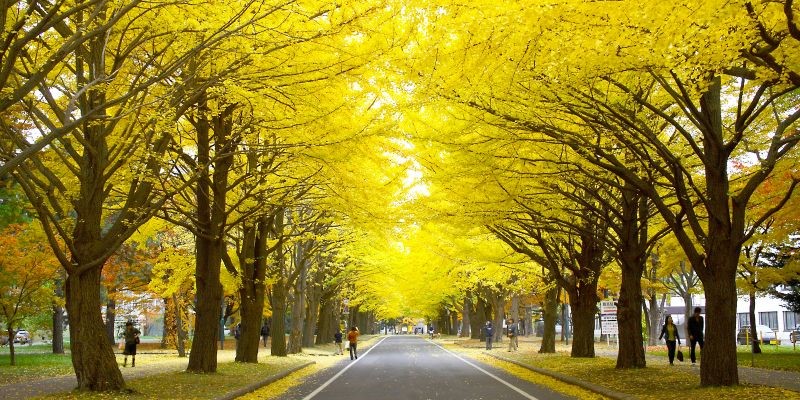 + Hàng cây bạch quả của đại học Hokkaido: sẽ thật tiếc nuối nếu đến Hokkaido mà không ghé qua ngôi trường xinh đẹp này. Đại học Hokkaido sở hữu hàng cây rẻ quạt lá vàng đẹp rực rỡ trên khoảng sân lớn. Cùng với đó là những hàng cây được trồng đều nhau bên cạnh lối đi, tạo ra một vùng trời đầy sắc vàng.
